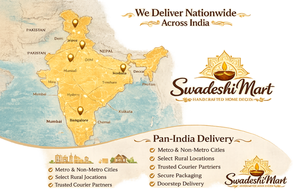 SwadeshiMart offers nationwide delivery across India, including metro cities, tier-2 and tier-3 cities, and nearby rural locations. Our service area covers states like Delhi NCR, Maharashtra, Uttar Pradesh, Rajasthan, Gujarat, Madhya Pradesh, Bihar, West Bengal, Karnataka, Tamil Nadu, Telangana, Andhra Pradesh, Kerala, Punjab, Haryana, Himachal Pradesh, Uttarakhand, and more. We partner with trusted courier services to ensure fast and secure delivery of home décor products.